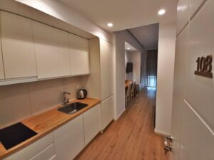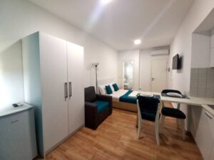 8СТУДИО 1085паркингСтудиото содржи 2 брачни кревети, фотеља на спуштање,и комплетно опремена кујна .Студиото нема тераса (француски балкон)