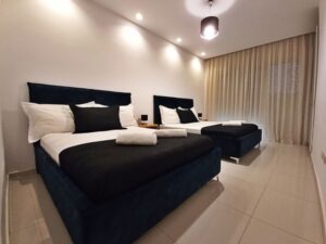 3ДУПЛЕКС 103-6+1паркингАпартманот содржи,  2 одвоени спални соби .Спална бр.1 содржи 2 дупли кревети,  Спална бр 2 содржи 1 брачен кревет.Комплетно опремена кујна, дневна соба,трпезариска маса и софа за спиење како помошен лежај(за деца) )  .Купатило, 2 клими, телевизор ,фрее  вифи, паркинг и тераса